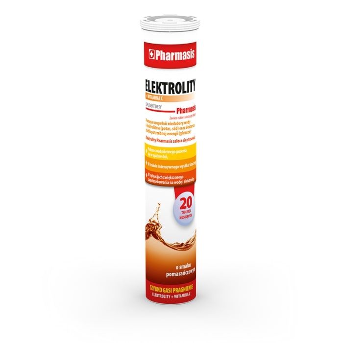 ELEKTROLITY z witaminą C Pharmasis to suplement diety w postaci tabletek musujących, który po rozpuszczeniu w wodzie stosuje się jako napój nawadniający w celu uzupełnienia niedoborów wody i elektrolitów oraz zapewnienia podaży energii.