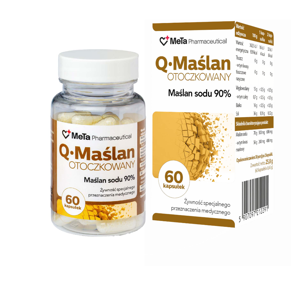 Q-Maślan to żywność specjalnego przeznaczenia medycznego zawierająca otoczkowany maślan sodu w postaci kapsułki, do postępowania dietetycznego w: